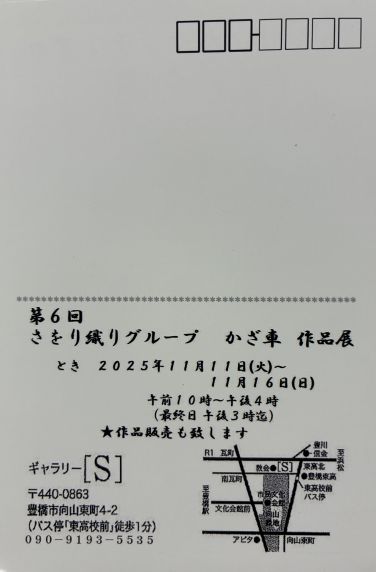 『第6回 さをり織りグループ かざ車 作品展』2025.11/11(火)〜11/16(日) 投稿日: 2025-10-21 投稿者: gallery-s 『第6回 さをり織りグループ かざ車 作品展』 【会期】 2025年11月11日(火)〜11月16日(日) 【時間】 10:00〜16:00(最終日は15:00まで) 作品販売も致します。