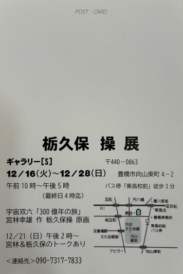 『栃久保 操 展』 投稿日: 2025-12-152025-12-20 投稿者: gallery-s 『栃久保 操 展』 【会 期】 2025年12月16日(火)〜12月28日(日) 10:00〜17:00(最終日 16:00迄) 12月21日(日)午後2時~ 宮林&栃久保のトークショーあり